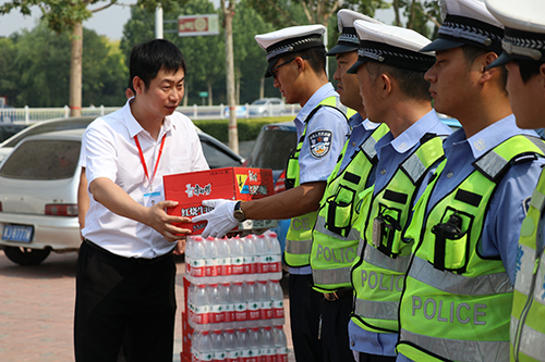 無論是寒冬的三九天還是酷夏的高溫日,他們都像一顆顆白楊挺拔的站在我們出行的路口處。霧霾嚴(yán)重的惡劣天氣、炎炎夏日的煩躁時節(jié),都有他們?yōu)槲覀兪刈o(hù)平安。在這夏至?xí)r節(jié)滄州智博信息技術(shù)有限公司自發(fā)組織了交警慰問活動,同時給五個站點的交警同志送去了礦泉水、冰糖雪梨、方便面、口罩等解暑物資。為滄州的交警同志送去了炎炎夏日的一絲清涼并表達(dá)了內(nèi)心的關(guān)切。